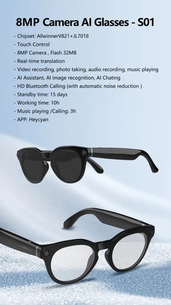 AI Smart Camera Glasses with ChatGPT, 8MP Camera Glasses, Bluetooth, Flash 2GB, Support Real-Time Translation with AI Assistant, AI Recognize Objects, Black/Transparent Lenses, Multifunctional Audio Eyewear for Women Men
